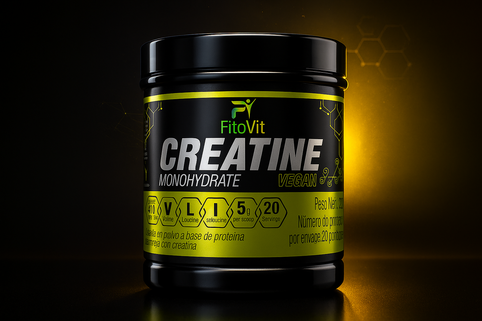 Fitovit combina creatina monohidratada pura con una base de proteína de arveja, aportando una alternativa 100% vegetal y libre de ingredientes artificiales.